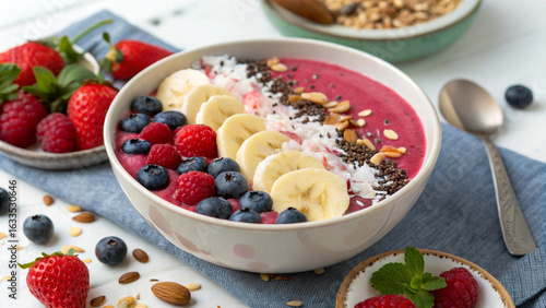 Healthy vegan smoothie bowl with berries, banana, and coconut flakes.