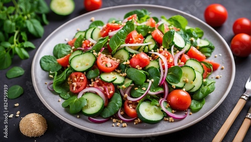Healthy vegetable salad of fresh tomato, cucumber, onion, spinach, lettuce and sesame on plate. Diet menu. Top view.