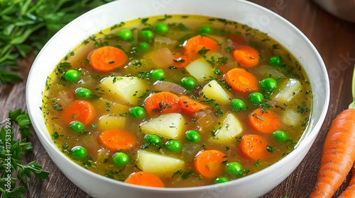Healthy vegetable soup, carrots, peas, potatoes, wooden table, home cooking, recipe.