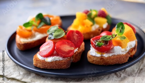 Healthy vegetarian toasts with cream cheese, Fruits. Summer fresh fruit toast sandwich. Generative Image