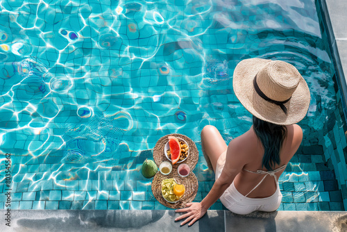 Healthy woman on swimming pool in luxurious tropical resort with have various food and drinks on table, Beach luxury lifestyle in summer vacation