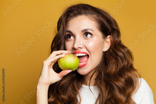 Healthy woman with white teeth biting apple fruit on bright yellow background