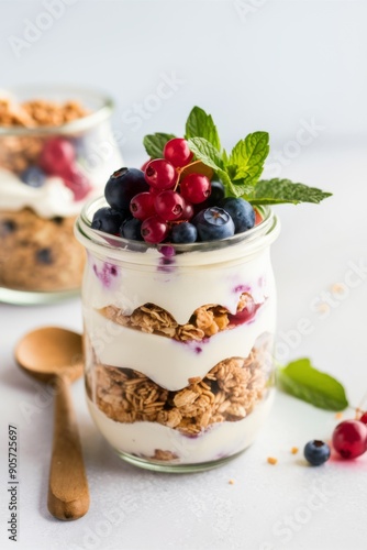 yogurt, parfait, berry, granola, mint, breakfast, dessert, snack, healthy, fresh, glasses, jar, food, nourishment, diet, layered, epicure, culinary, closeup, organic, dairy, creamy, kitchen, crunchy, antioxidant, blueberry, freshness, tasty, wholesome, meal, sweet, appetising, background, redcurrant, refreshing, natural, cooking, light, raspberry, delicious, dining, spoon, homemade