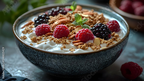 yogurt, granola, breakfast, bowl, berry, raspberry, blackberry, almond, healthy, food, dessert, sweet, dairy, smooth, delicious, nourishment, meal, morning, lunch, smoothie, treat, fruit, parfait, photo, styling, closeup, close, up