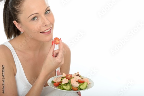 Healthy Young Woman Holding a Plate of Salmon Salad