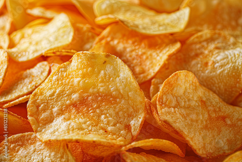 Heap of crispy golden potato chips, a popular savory snack food, photographed in appetizing detail