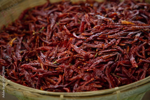 heap of dry chili vegetable in market .