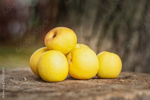 Heap of fresh ripe quince fruit on an old tree stump. Shallow depth of field.