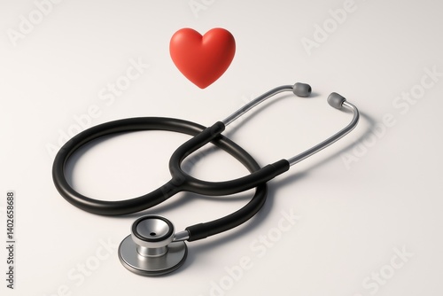 Heart Health Checkup: A black stethoscope rests on a pristine surface, with a vibrant red heart hovering gently above it, symbolizing care, compassion, and the importance of heart health.