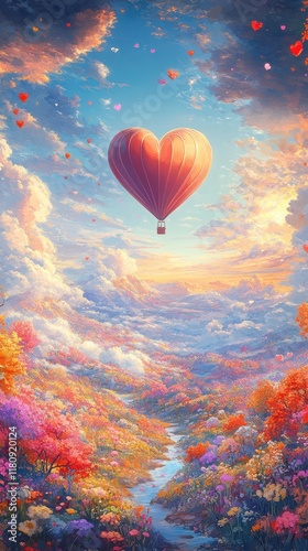 nubes, balloon, hot air, autumn, landscape, sky, cloud, colours, vibrant, flower, tree, river, stream, vale, hill, mountain, scenery, nature, beautiful, magical, dreamy, romantic, love, affection, passion, peace, serenity, calmness, calm, sunrise, sunset, light, warm, soft, gentle, whimsical, fantasy, art, painting, illustration, digital, colourful, high-coloured