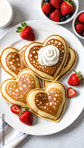 heart shaped pancakes with strawberries on a white plate