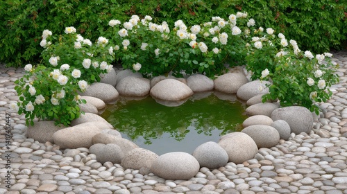 duck pond, nubes, shaped, stone, grey, rose, white, garden, shrubbery, green, tranquil, serene, peaceful, nature, landscaping, water, rock, pebble, floral, plant, flower, outdoors, summer, spring, daytime, calm, still, beauty, aesthetic, design, landscaped, feature, stone, border, romantic, scene, natural, leaf, rock, rose, flower, decor, backyard, home