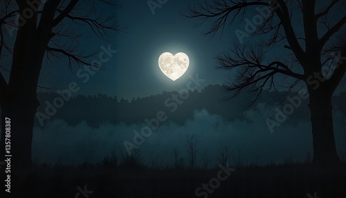Heart silhouette against full moon with tree branches and misty atmosphere