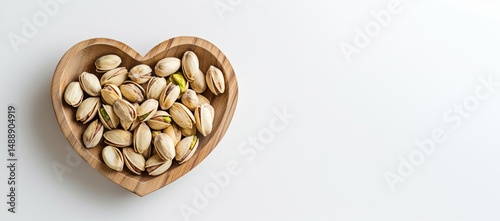Heart-shaped bowl filled with pistachios represents health and love against a white backdrop