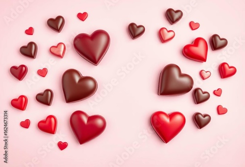 Heart-shaped chocolates arranged in a frame on a pastel pink background Valentine's Day, background, day