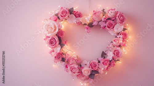 Heart-shaped floral arrangement with soft pink roses and twinkling lights hanging on a wall