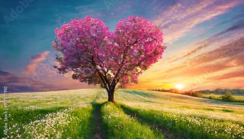 Heart-shaped tree in a blooming field at sunset with a painted texture, against a vibrant sky background, concept of love and nature. AI generated image