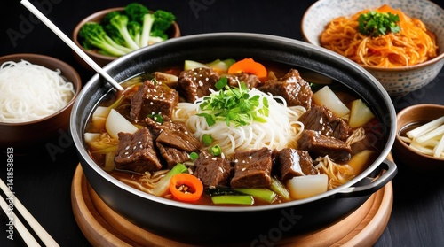 fresh vegetable, sesame seeds, herb, noodle, sauce, wooden table, asian cuisine, comfort food, chopstick, epicure, dinner, lunch, culinary, delicious, broth, korean food, steaming, homemade, soup bowl, green onion, carrot, broccoli, flavorful, aromatic, closeup, table setting