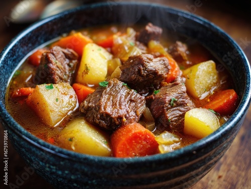 stew, beef, potato, carrot, onion, herb, soup, hot, steaming, bowl, rustic, dinner, comfort, food, cookery, hearty, flavorful, rich, meal, delicious, brown, warm, texture, cube, ingredient, cooked, vegetable, liquid, dinnerware, porcelain, wooden, table, gold, aromatic, tasty, appetising, deliciously, homemade, classic, alimentary, protein, warmth, comfort food, culinary, photo, closeup, food photography