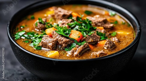 Hearty beef stew in bowl, dark background, autumnal feel, food blog use