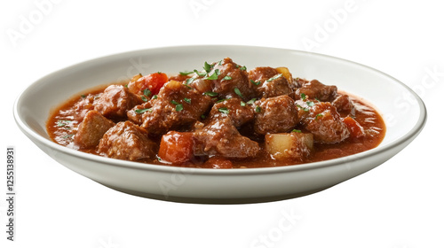 Hearty Beef Stew with Vegetables in Rich Tomato Sauce – Perfect Comfort Food Dish on White Plate