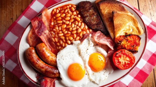breakfast, egg, fried egg, bacon, sausage, bean, baked beans, toast, meat, meal, food, traditional, hearty, delicious, plate, morning, brunch, cafes, dinner, cookery, eatery, tasty, savoury, protein, carbohydrate, fats, energy, nourishment, indulgence, comfort food, classic, rich, gold, orange, white, brown, closeup, studio shot, indoor, table, vibrant