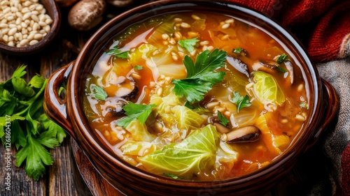 Hearty cabbage soup concept. A vibrant bowl of healthy vegetable soup garnished with fresh herbs, showcasing a delicious mix of colors and textures.