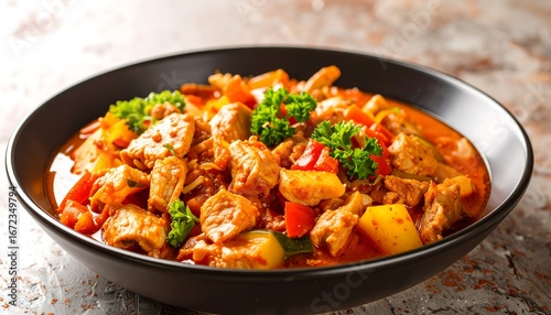 chicken, stew, vegetable, bowl, food, dish, meal, cookery, hot, spicey, flavorful, colourful, hearty, dinner, plate, eatery, delicious, appetising, healthy, aromatic, savoury, red, orange, black, closeup, parsley, potato, pepper, courgette, cooking, tasty, protein, dinnerware, beautiful, bright, creative, modern, elegant, stylish, professional, decorative, vibrant, stunning, amazing, marvellously, fantastic, gorgeous