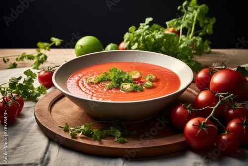 Hearty gazpacho on a rustic plate against a minimalist or empty room background