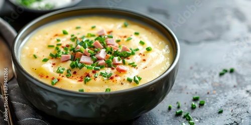 Hearty Loaded Baked Potato Soup with Ham, Chives, and Seasonings. Concept Baked Potato Soup, Loaded with Ham, Chives, Hearty Flavor, Seasonings