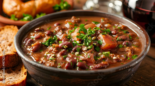 red beans, beef stew, comfort food, rustic, dinner, soup, chili, parsley, delicious, appetising, homemade, savoury, warm