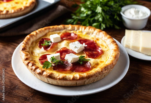 Hearty Rustic Appeal: A pie featuring warm, golden dough balls with two cut to display cured meats and cheese spilling out. The light dish rests on a dark wooden table with a blurred, dark background