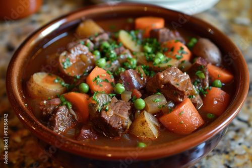 beef, stew, rustic, hearty, tender, chunk, carrot, potato, pea, bowl, warm, comforting, meal, soup, dinner, lunch, homemade, cookery, food, dish, vegetable, savoury, delicious, winter, traditional, fresh, herb, garnish, wholesome, alimentary, broth, rich, classic, comfort food, culinary, comfort