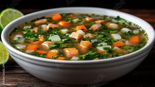 soup, salmon, vegetable, hearty, creamy, broth, warm, healthy, delicious, flavorful, dinner, meal, cookery, food, dish, bowl, white, wooden, table, lime, carrot, potato, onion, parsley, fresh, hot, appetising, alimentary, comfort, easy, simple, lunch, protein, diet, savoury, light, nutrient, eatery, homemade, tasty, ingredient, vegan, vegetarian