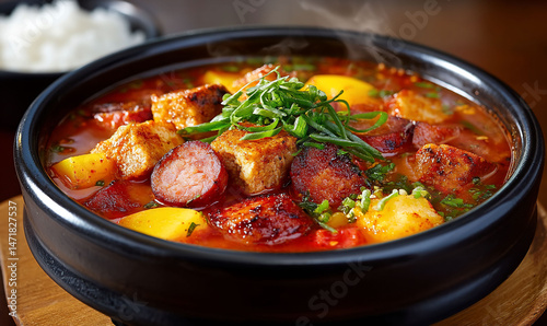 Hearty stew in a black bowl, with potatoes, sausage, and greens. Steaming dish with rice
