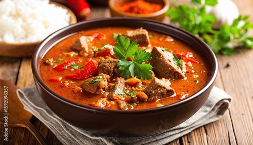 stew, bowl, food, rice, meat, spicey, red, sauce, vegetable, hearty, rustic, brown, wooden, table, dinner, lunch, delicious, cookery, comfort, appetising, dish, ingredient, flavorful, traditional, preparation, tasty, hot, deliciously