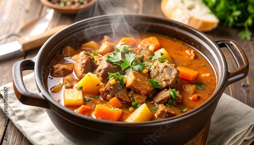 stew, hearty, simmering, pot, food, hot, steam, meat, vegetable, potato, carrot, broth, rustic, brown, wooden, table, bread, parsley, delicious, cookery, healthy, comfort, meal, warm, aroma, cooking, dish, wholesome, alimentary, appetising, homemade, ingredient, tasty, beef, deliciously, flavorful, fresh