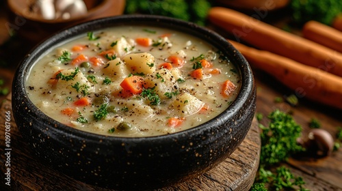 Hearty vegetable soup in rustic bowl with fresh herbs and carrots