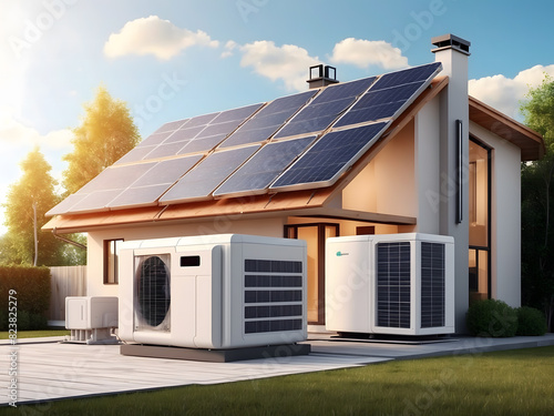 Heat pump next to the house and solar panels on the roof. The concept of an energy-efficient home. 3D illustration design