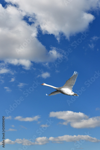 Heavenly landscape. Mute swan (Cygnus olor) flying