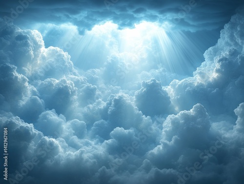 cloud, sky, sunlight, heaven, light, blue, celestial, radiant, aethereal, airy, fluffy, dreamy, immensity, panorama, atmosphere, serene, awe, majestic, divine, peace, beauty, illuminated, vista, calm, hope, inspiration, dreamlike, overcast, heavenly, soft, vaporous, nature, weather, ray, sunbeam, dream, wonder