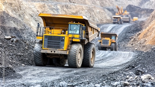 Heavy machinery operates in a mining site, transporting materials along rugged terrain, showcasing industrial work in action.