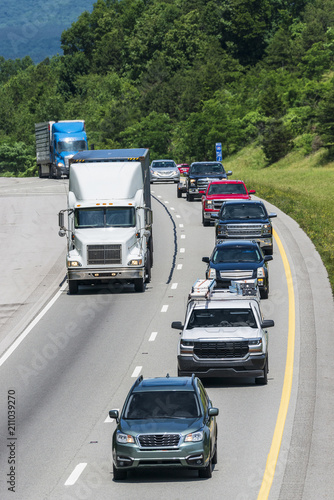 red, car, automobile, blue, color image, delivery, diesel, driving, rig, hauling, lorry, energy, fossil fuel, global warming, highway, vertical, industry, interstate, journey, land vehicle, motion, outdoors, people traveling, pollution, road, road trip, semi-truck, shipping, tractor-trailer, traffic, transportation, truck, trucking, white, black, green, grass, tree, heavy, summer