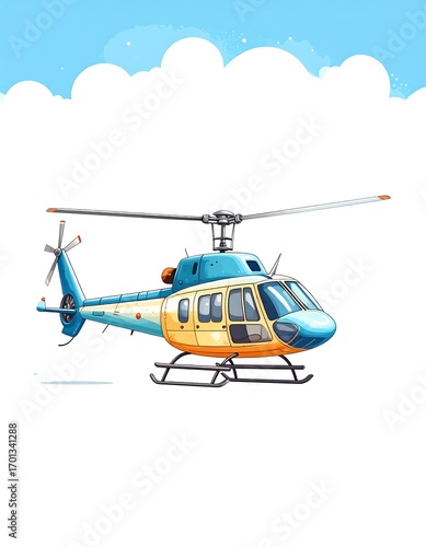 helicopter, flight, sky, cloud, travel, aircraft, aviation, transportation, rescue, aerial, chopper, air, blue, yellow, machine, vehicle, rotor, engine, propeller, transport