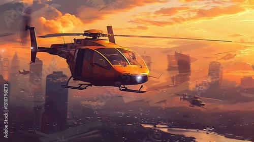 helicopter, sunset, city landscape, cloud, urban, skyline, flight, transportation, aerial, landscape, technology, aviation, orange, dusk, horizon, vehicle, night, light, nature, travel, adventure, exploration, modern, energy, vibrant, motion, sky, architecture, city, scenic, view, industry, weather, environment, beauty, transport, evening, air, modernity, dynamic, vehicle, atmosphere