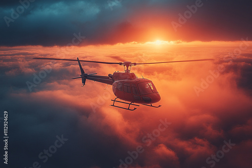 helicopter, cloud, sunset, sky, orange, red, dusk, flight, aerial, view, up high, below, sun, ray, light, gold, horizon, vibrant, colours, atmosphere, dramatic, majestic, landscape, scenery, beautiful, nature, aviation, aircraft, transportation, travel, adventure, freedom, soaring, powerful, machine, vehicle, engine, propeller, blade, altitude, height, speed, movement, dynamic
