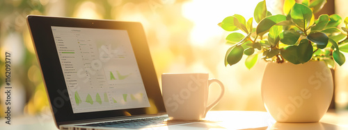 stylish, workspace, laptop, traffic, analysis, white, hot drink, cup, decorative, plant, bright, desk, blurred, background, sunny, glow, professional, setup, datum, visualisation, digital, tool, modern, environment, clean, aesthetic, technology, business, minimalist, decor, inspiration, calm, atmosphere, productivity, warm, lighting, generative, ai, computer, notebook, office, keyboard, cyberspace, screen, monitor, table, work