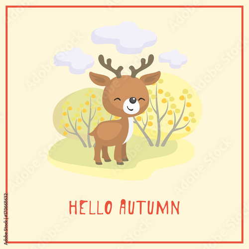 Hello autumn. Greeting card with the image of cute forest animal and trees in cartoon style. Children’s illustration.