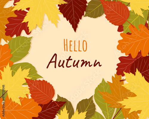 Hello autumn postcard. Red, green and orange leaves with place for text. Fall season plants. Wild life and flora. Floristry and botany. Poster or banner. Cartoon flat vector illustration
