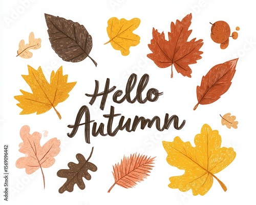 hello autumn text with falling leaves
